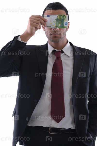 Бизнесмен закрывает глаза бумажной купюрой