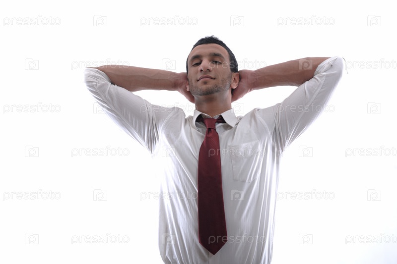 Портрет делового человека, обхватившего голову руками на белом фоне