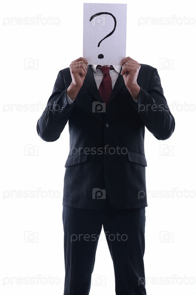 Деловой человек закрывает лицо листом бумаги с вопросительным знаком на нем