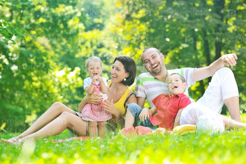 Молодая пара со своими детьми на природе