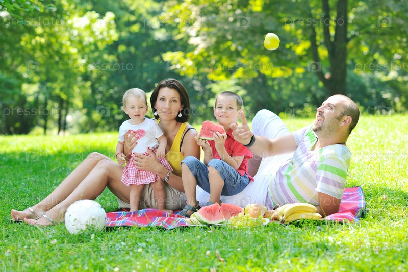 Молодая пара со своими детьми на пикнике