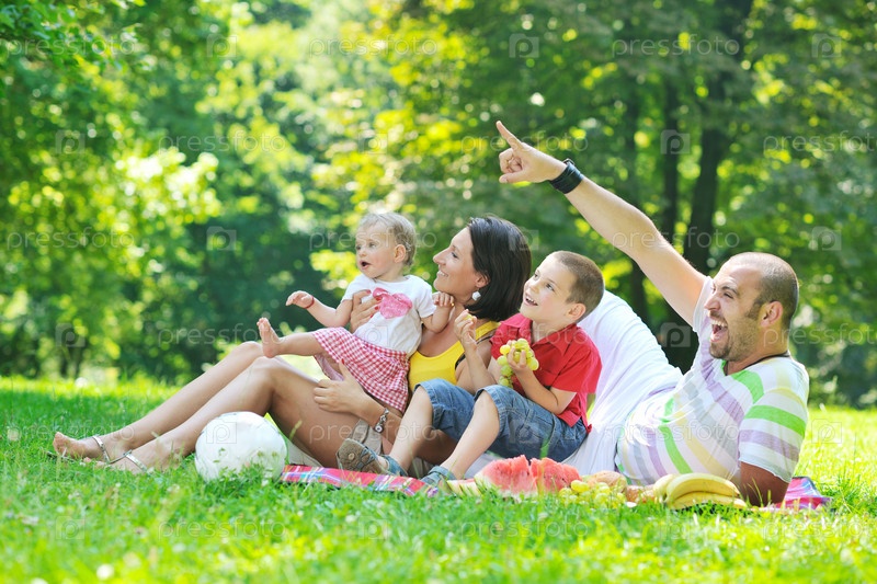 Молодая пара со своими детьми на пикнике в летнем парке