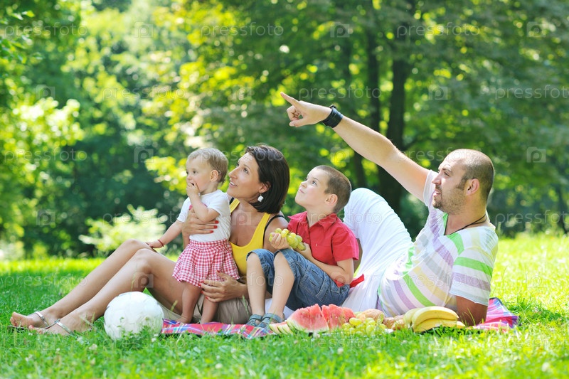 Молодая пара со своими детьми на пикнике в летнем парке