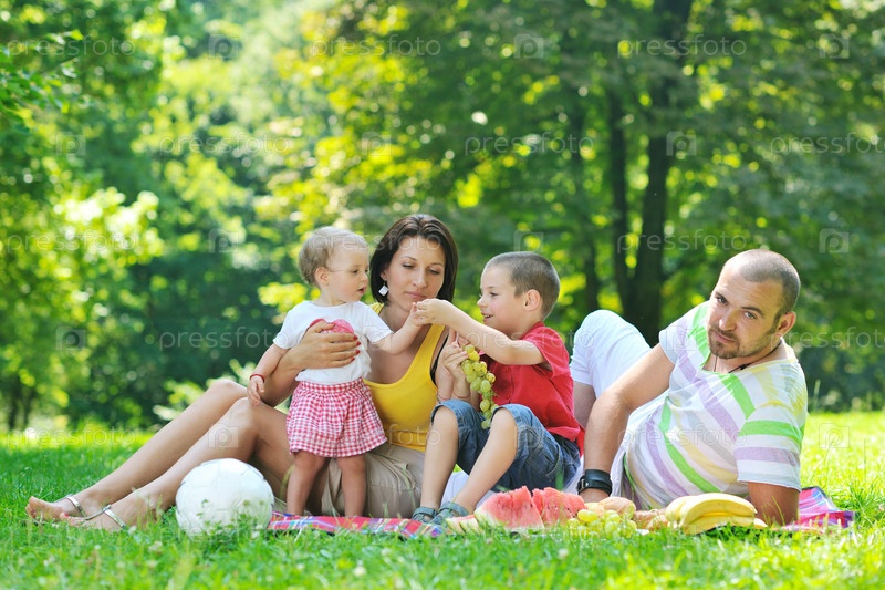 Молодая пара со своими детьми на пикнике в летнем парке