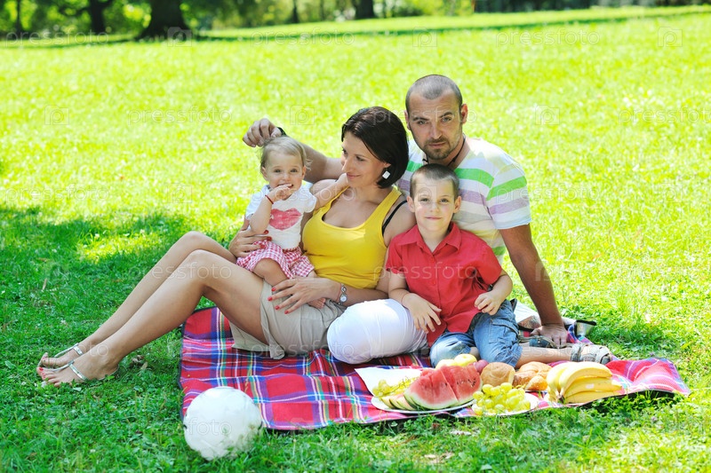 Молодая пара со своими детьми на пикнике в летнем парке
