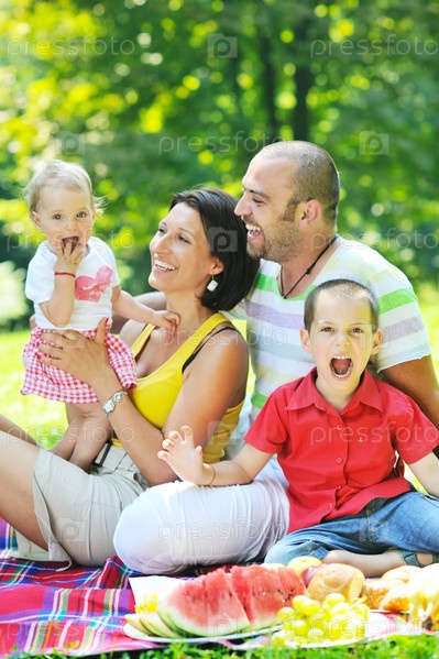 Молодая пара со своими детьми на пикнике в летнем парке