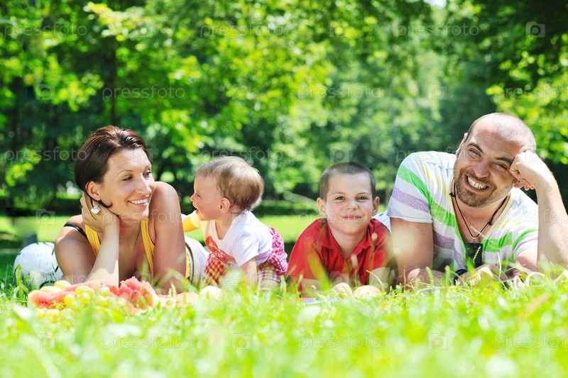 Молодая пара со своими детьми на пикнике в летнем парке