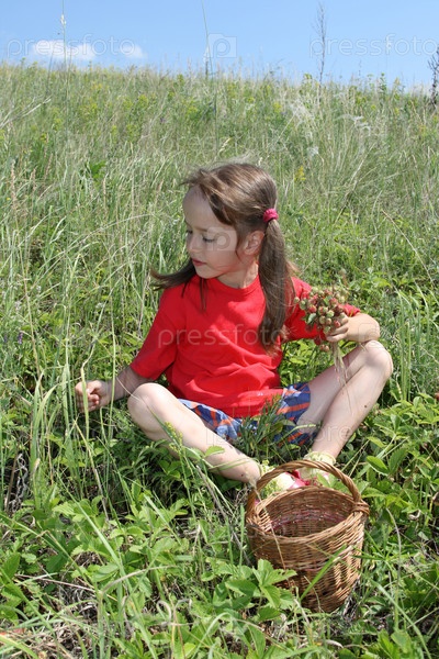 Маленькая девочка сидит и собирает дикие клубники в корзине