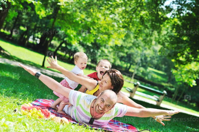 Молодая семейная пара с детьми на природе