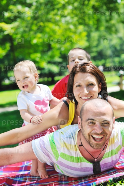 Молодая семейная пара с детьми на природе