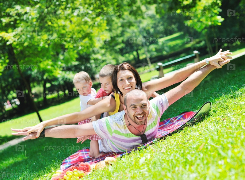 Молодая семейная пара с детьми на природе