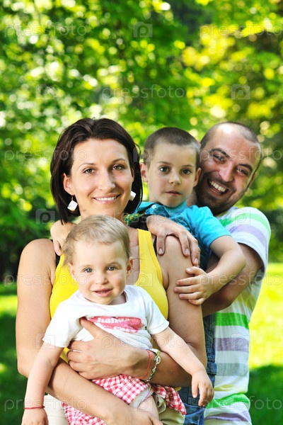 Молодая семейная пара с детьми на природе