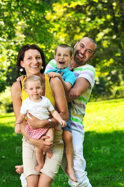 Молодая счастливая семья с детьми в летнем парке