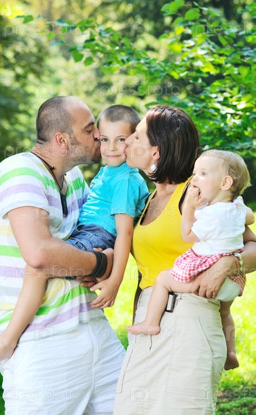 Молодая счастливая семья с детьми на отдыхе в летнем парке
