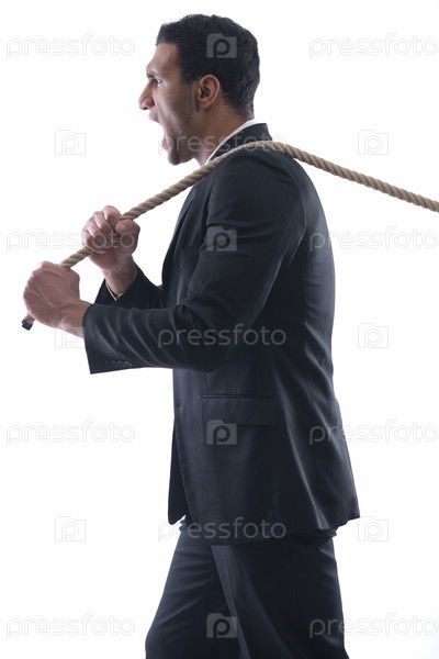 Деловой мужчина тянет канат на белом фоне