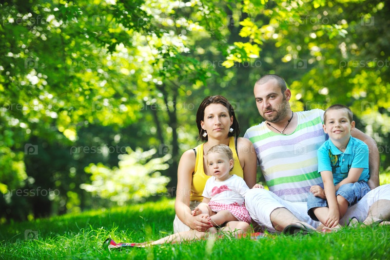 Молодая счастливая семья с детьми на отдыхе в летнем парке