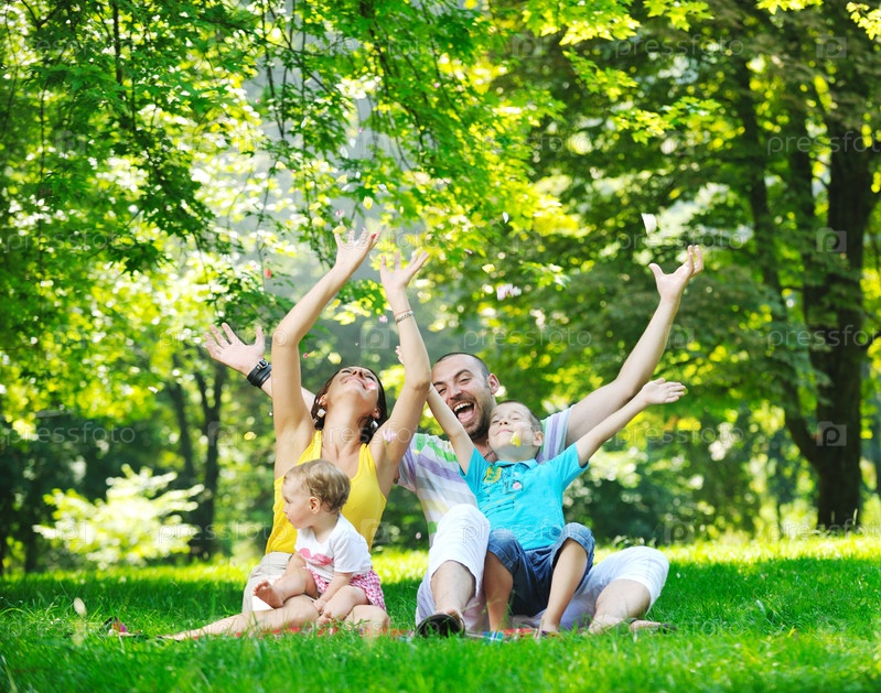 Молодая счастливая семья с детьми на отдыхе в летнем парке
