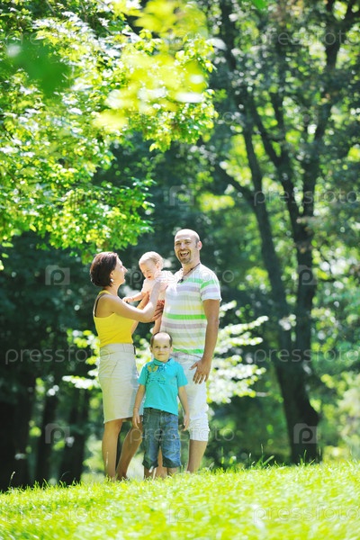 Молодая счастливая семья с детьми на отдыхе в летнем парке