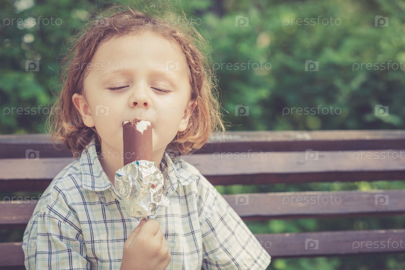 Маленький мальчик ест мороженое в парке