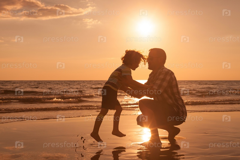 Отец и сын на пляже во время заката
