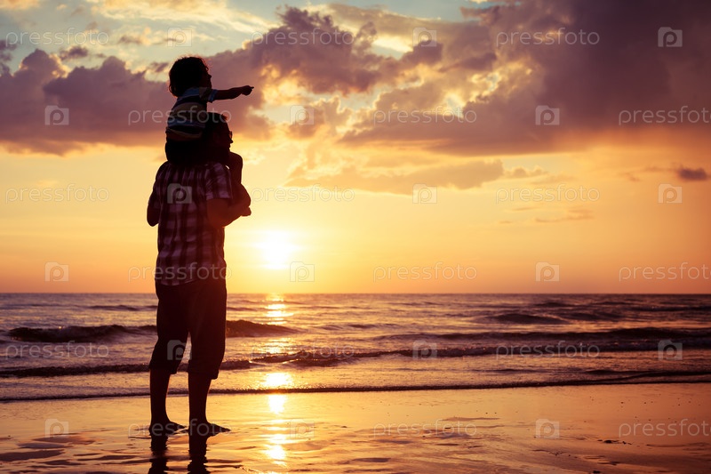 Отец и сын на пляже во время заката