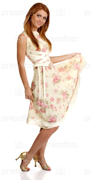 Портрет рыжеволосой девушки в летнем платье на белом фоне