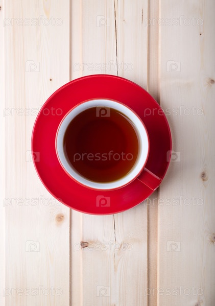 Красная чашка с чаем на блюдце