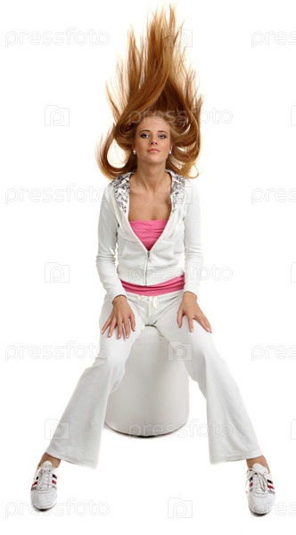 Портрет рыжеволосой девушки в спортивном костюме на белом фоне