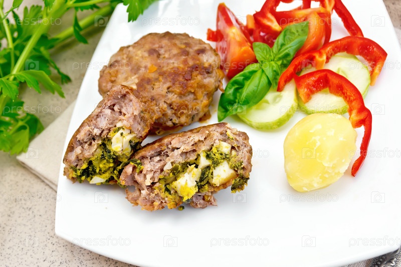 Котлеты фаршированные в тарелке на гранитном столе