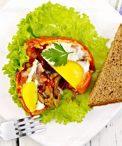 Яичница в помидоре с ветчиной и грибами