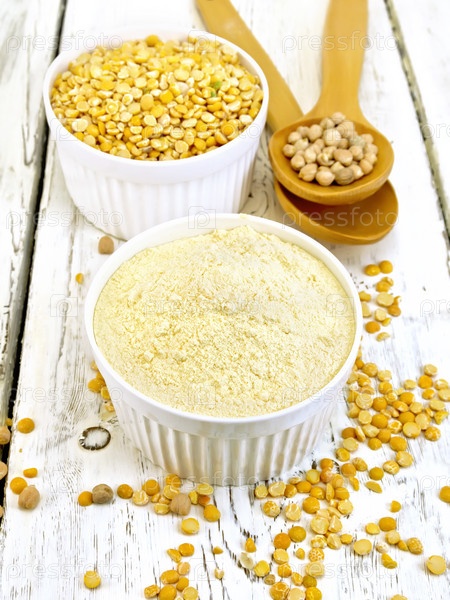 Мука гороховая и горох в чашах на столе