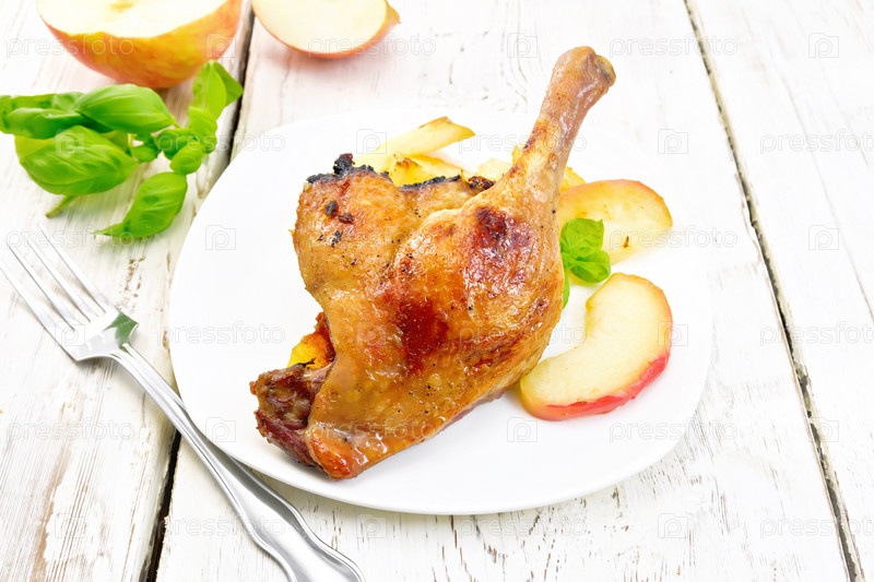 Утиная ножка с яблоком в тарелке на доске