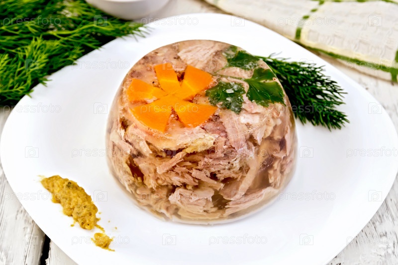 Холодец в тарелке с горчицей и укропом на доске