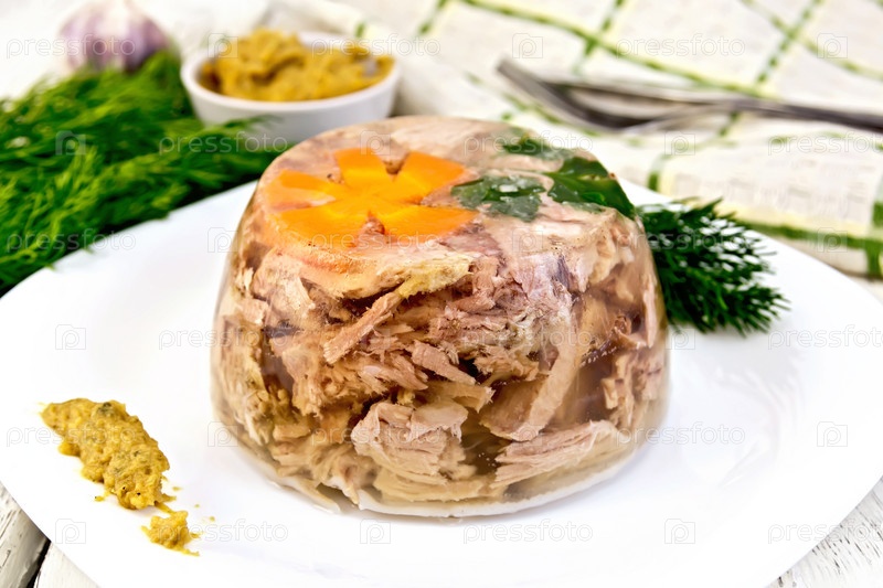 Холодец в тарелке с петрушкой на доске