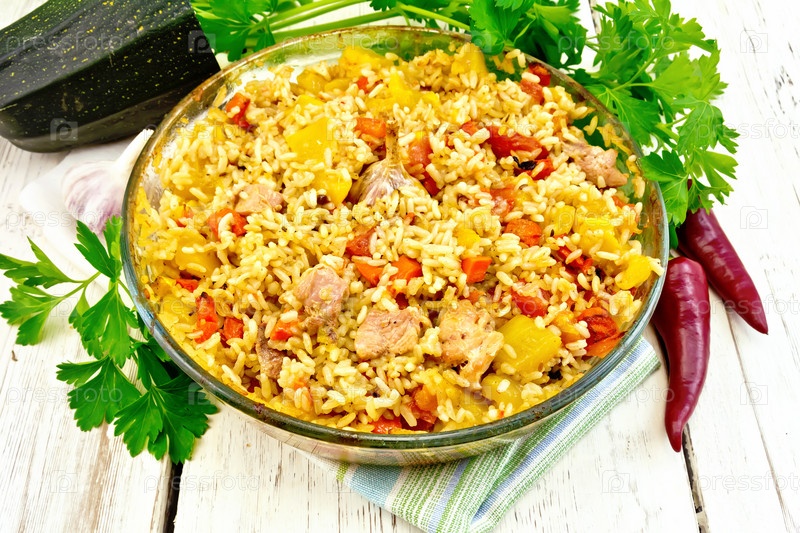 Рис с курицей и кабачками в сковороде на доске