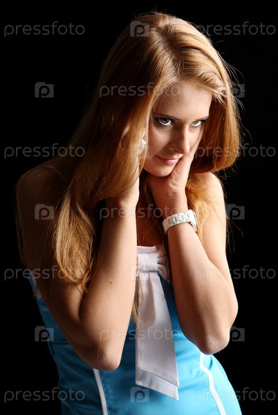 Рыжеволосая девушка в голубом платье на черном фоне