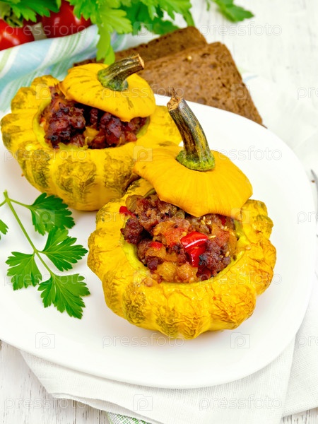 Патиссоны желтые фаршированные мясом на светлой доске
