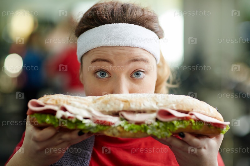 Толстая девушка с гигантским бутербродом