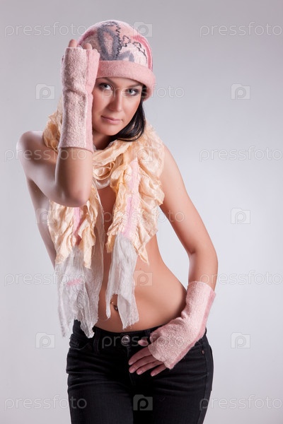 Молодая привлекательная женщина, одетая в модную ручную одежду на изолированном фоне