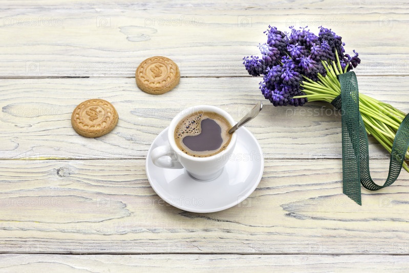 Чашка кофе и букет мускари