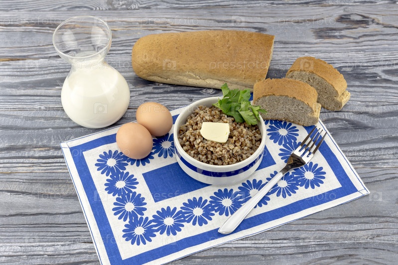 Гречиха, хлеб, яйца и молоко