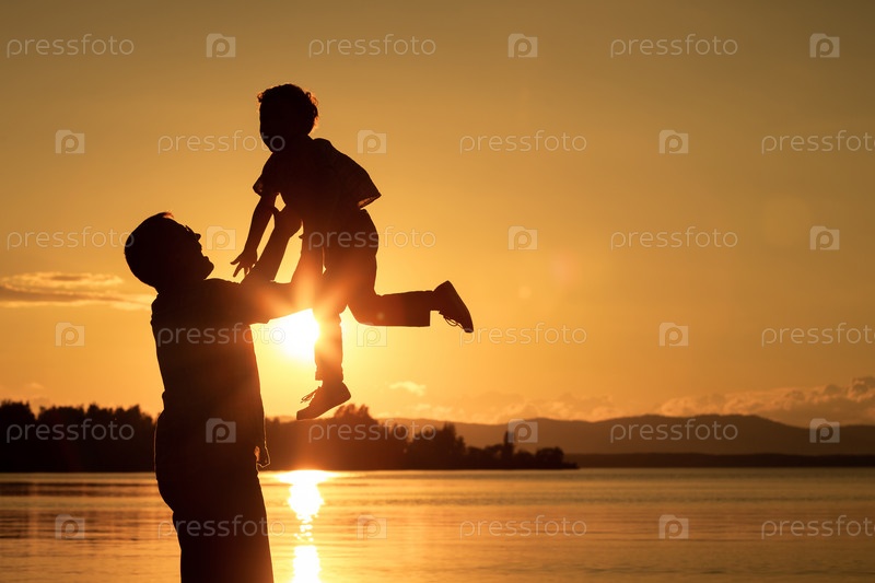 Отец и сын на побережье озера