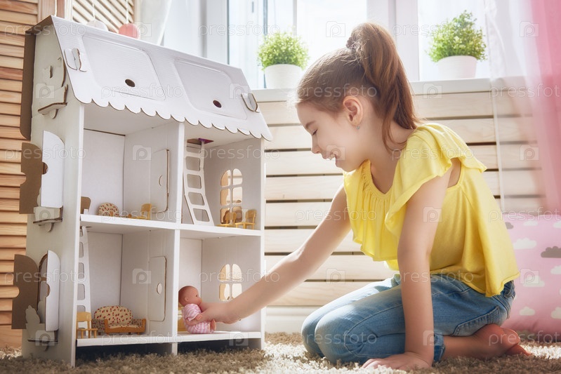 Девочка играет с кукольным домом
