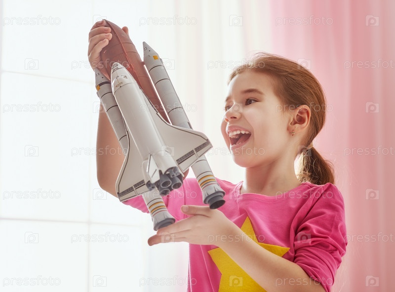 Девочка играет с игрушечной ракетой