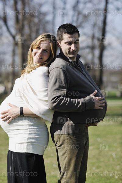 Молодая беременная женщина с мужем на открытом воздухе
