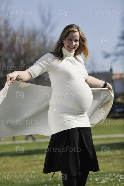 Счастливая молодая беременная женщина на открытом воздухе в солнечный день