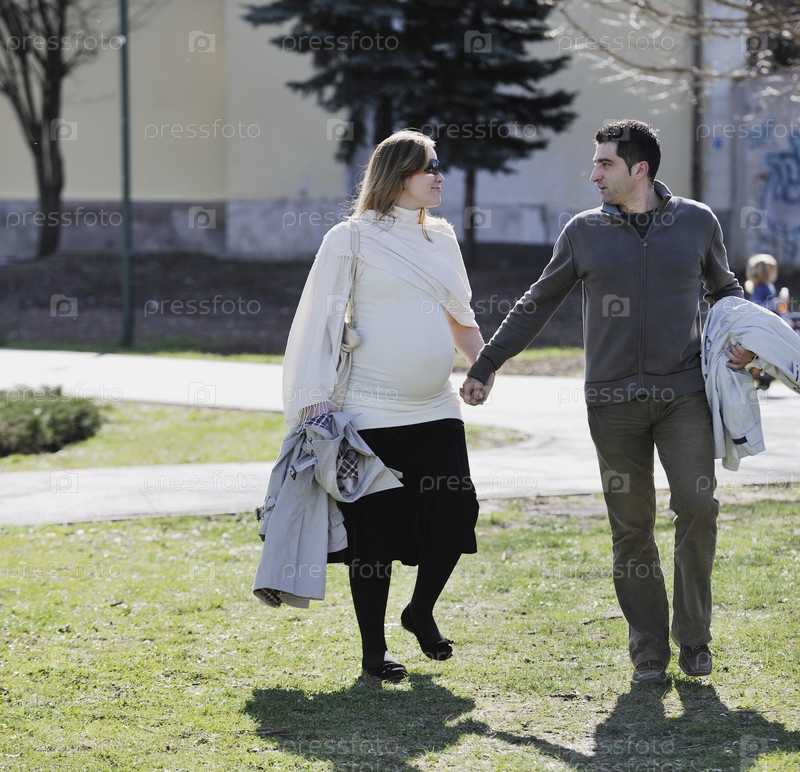 Счастливая молодая беременная женщина с мужем на открытом воздухе