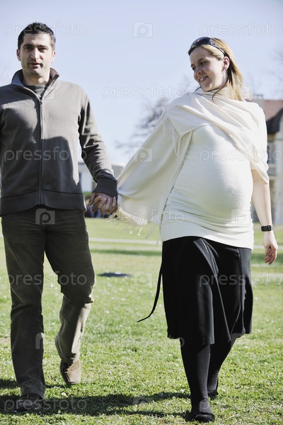 Счастливая молодая беременная женщина с мужем на открытом воздухе