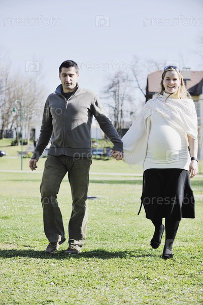 Счастливая молодая беременная женщина с мужем на открытом воздухе
