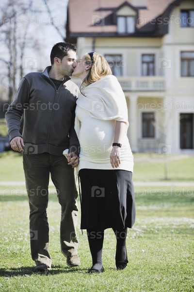 Счастливая молодая беременная женщина с мужем на открытом воздухе